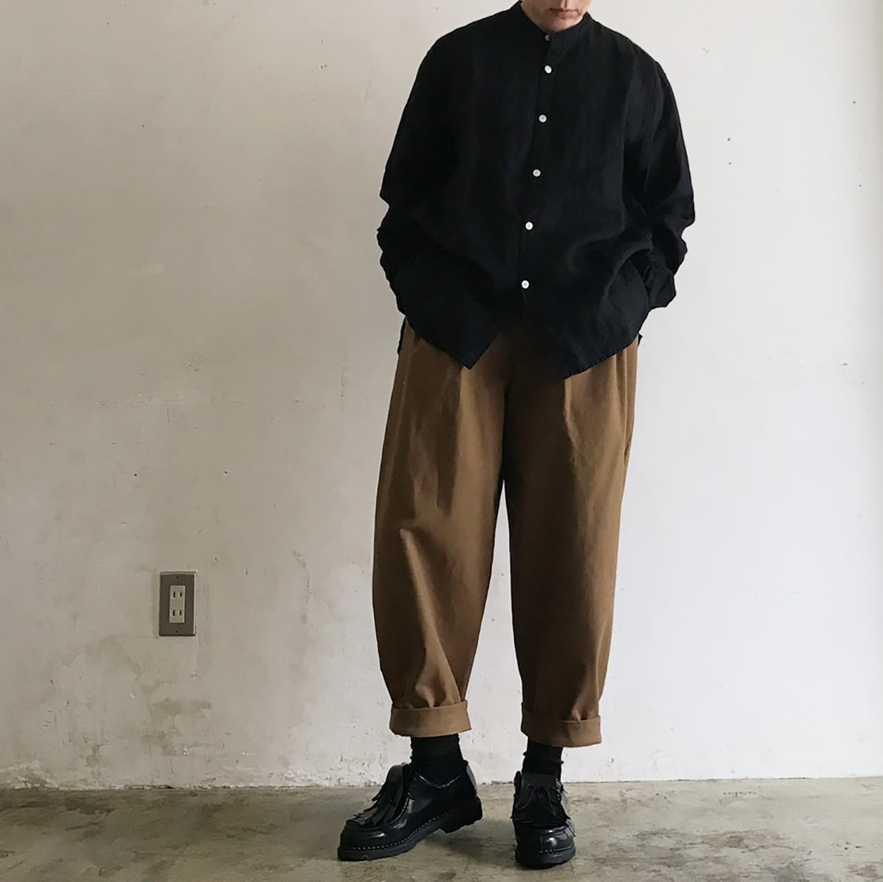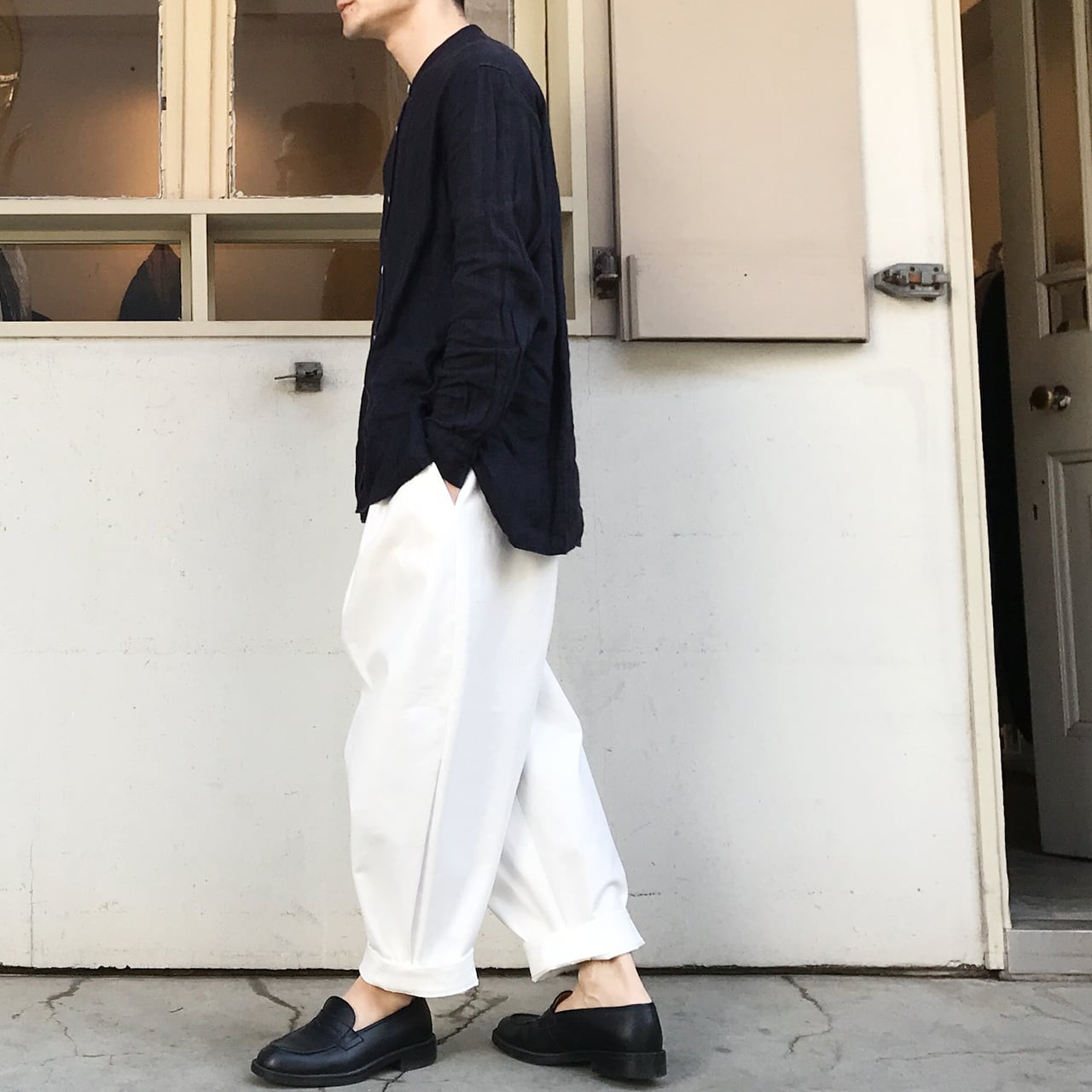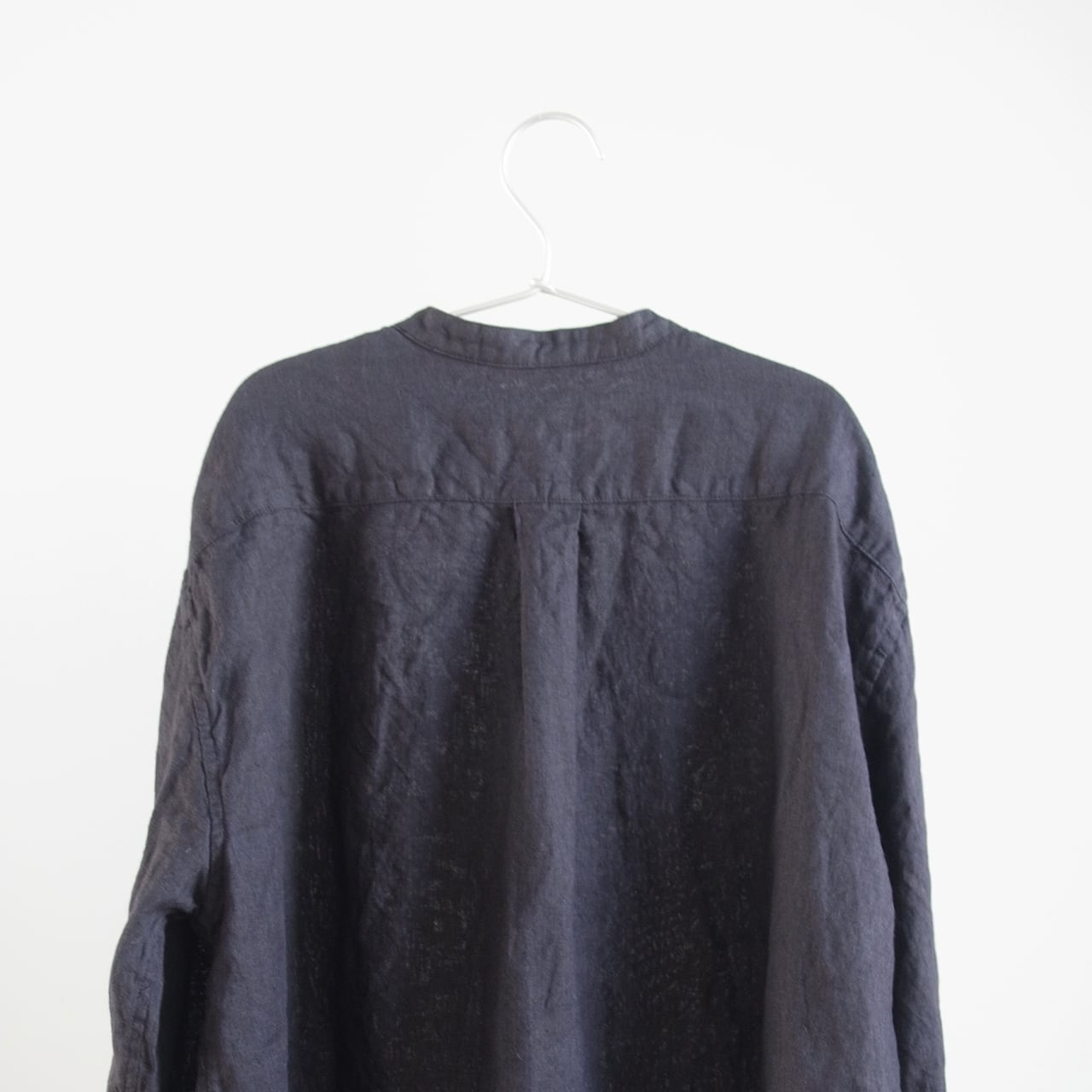 薄生地のリトアニア産リネンで仕立てたシンプルなバンドカラー長袖シャツ。