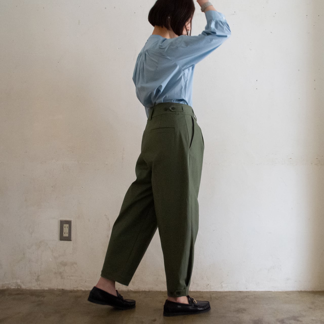 裾をロールアップすることでエッグの曲線を際立たせたり、タブをそのまま見せたり、様々な着こなしが楽しめます。