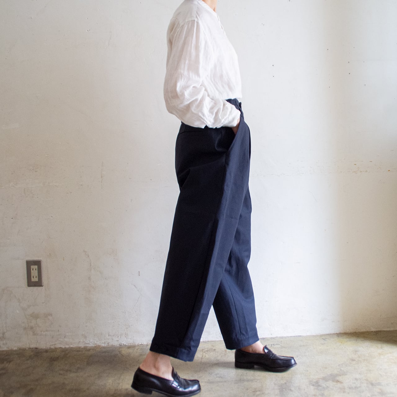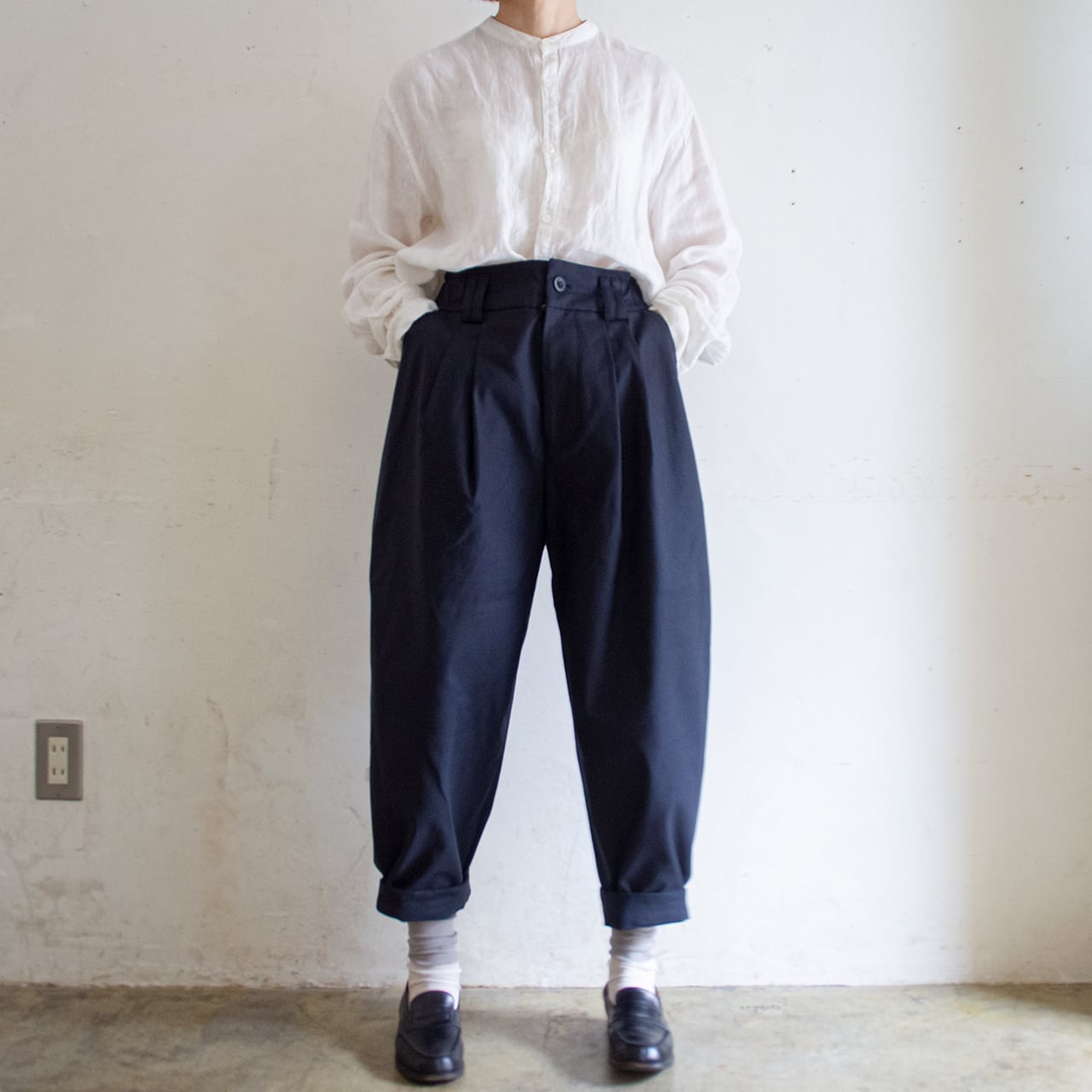 裾をロールアップすることでエッグの曲線を際立たせたり、タブをそのまま見せたり、様々な着こなしが楽しめます。