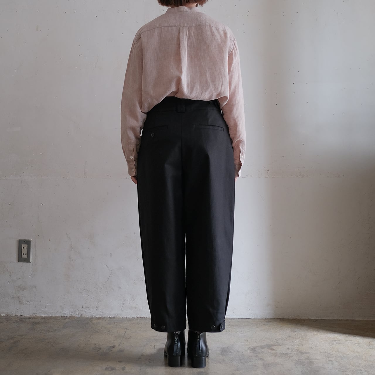 ミリタリーを取り入れたエッグシルエットのパンツ。
