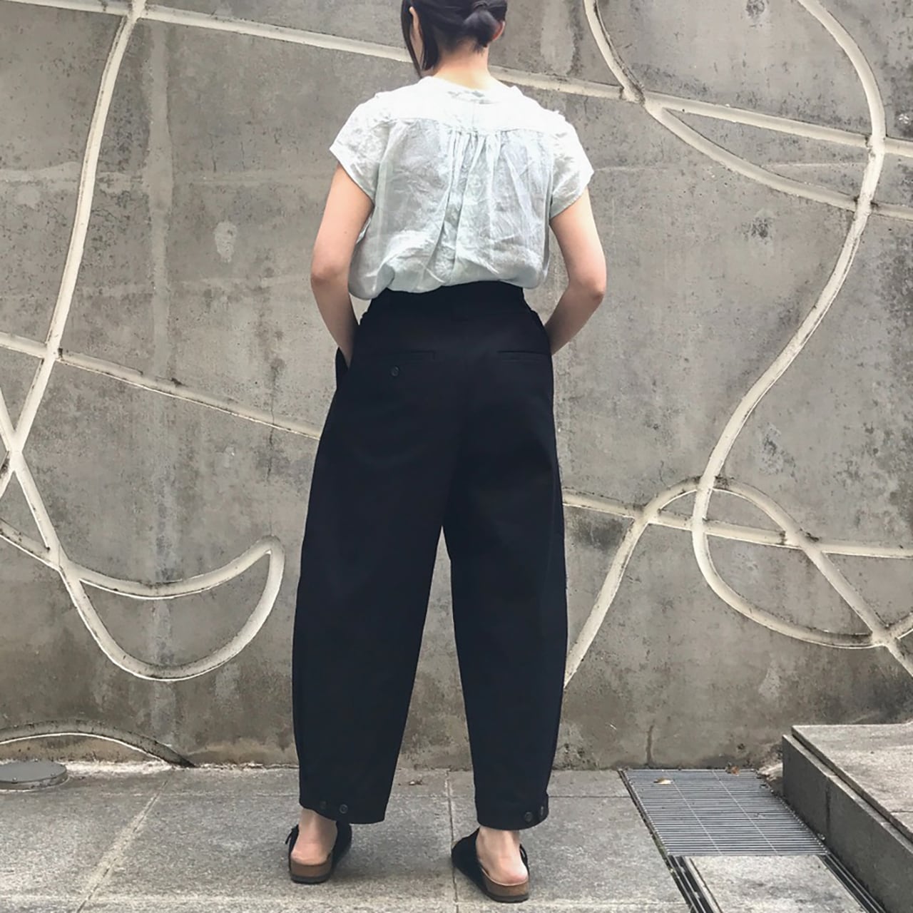 裾をロールアップすることでエッグの曲線を際立たせたり、タブをそのまま見せたり、様々な着こなしが楽しめます。