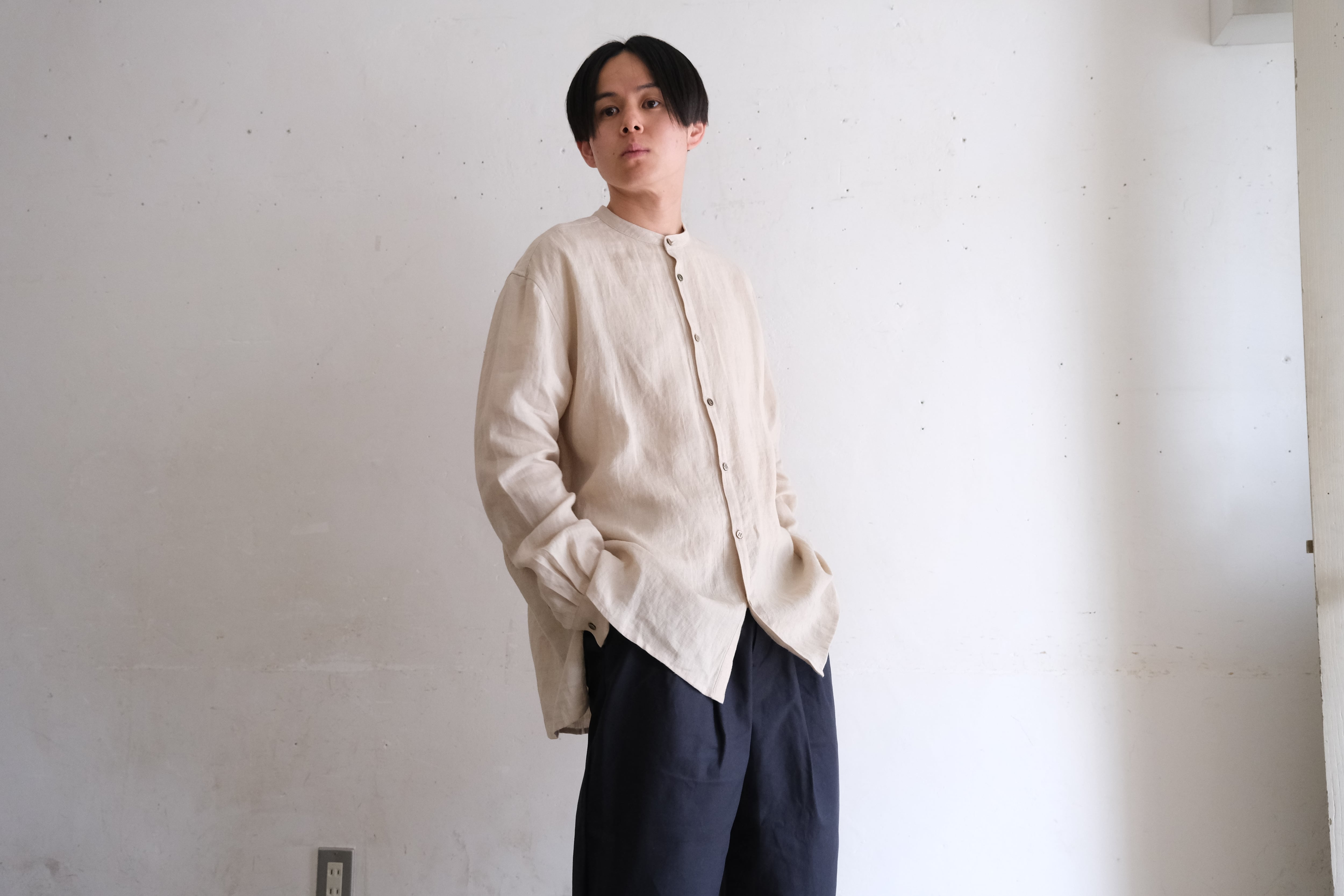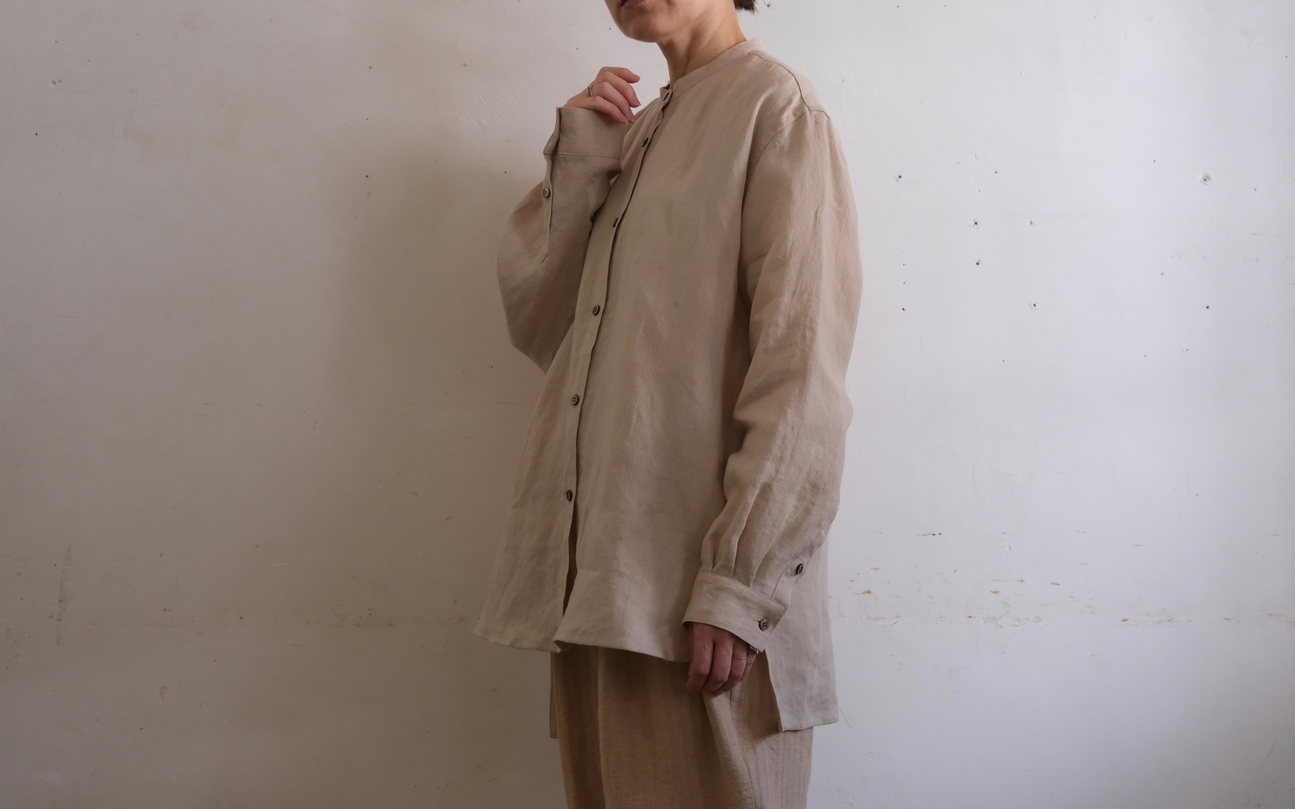 リトアニア産リネンで仕立てたバンドカラーの長袖シャツ。