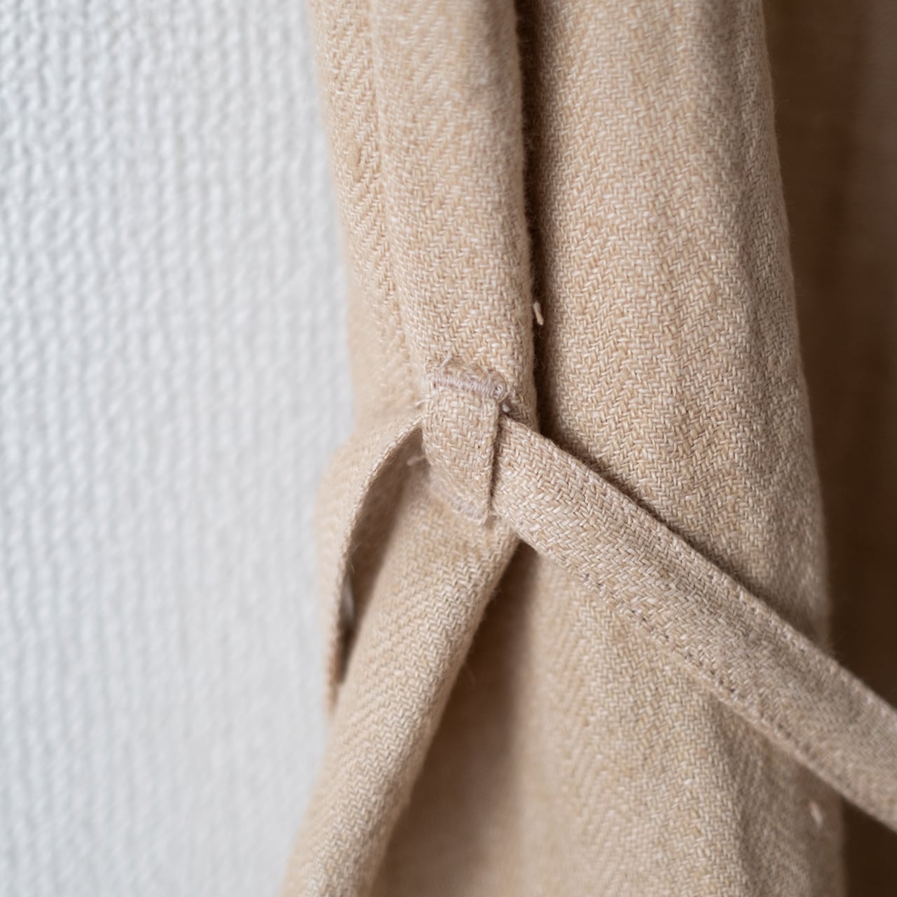 ベルトは結ばずに垂らして着ると、ボックスシルエットを楽しめます。