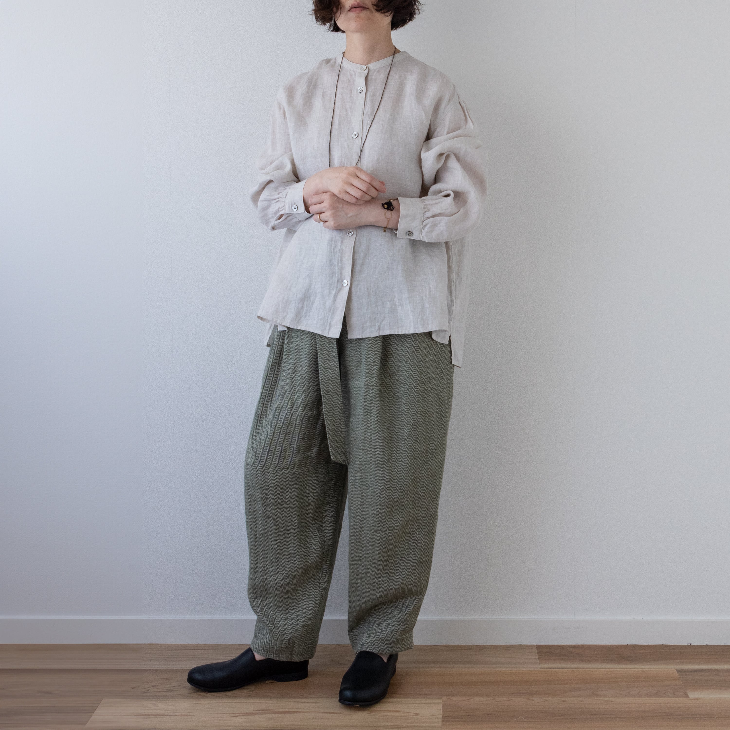 リトアニアで生産した、オリジナルのライトウェイトリネンで仕立てたバンドカラーギャザーシャツ。